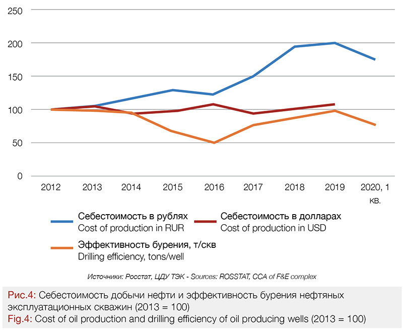 It can be said that within the existing framework of relationships between the major participants, the objective of efficiently increasing oil production hasn’t been achieved to sufficiently provide strategic stability in the oil production industry. Despite significant progress in drilling and completion technologies, drilling efficiency being expressed in the form of new well oil production hasn’t exceeded the level reached in 2012 while the production cost (in RUR) has almost doubled (Fig. 4).