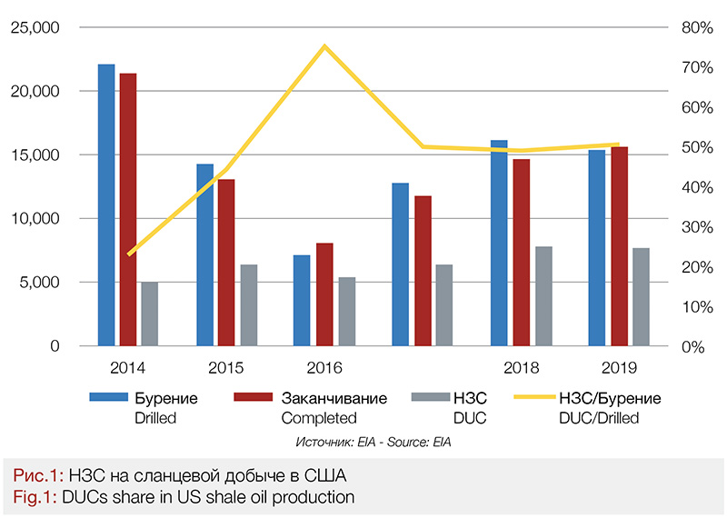 From this perspective GAP is meant to become one of the primary measures developed as a response to the major changes in the economic environment after a period of continuous oil production growth in Russia starting since 1998 (except slight declines in 2008 and 2017 – by 0.6% and 0.3% respectively). Referring to international oil production practice – most notably considering shale oil production (LTO) in US – it may be found that over a long period of time that DUCs in the US are already considered as an important part of a set of instruments intended to ensure system flexibility. As a response to oil prices downturn in 2014-2016 DUC´s share in US sharply increased from 23% to 75% and then stabilized at around 50% (Fig. 1).