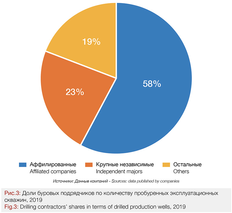 Considering the various types of relationships between the Customers and contractors, the affiliated drilling companies dominate the market. For this analysis the contractors who have a significantly close relationship with their key customers are being considered as they account for the largest percentage (58%) of the development wells put into production in 2019. This group, with different business organizational and legal structures, includes the drilling units of Surgutneftegaz, RN-Burenie (a Rosneft subsidiary), Megion Drilling Directorate (a Slavneft-Megionneftegaz subsidiary) and independently owned contractors that have most of their business (> 75%) derived from a single customer.