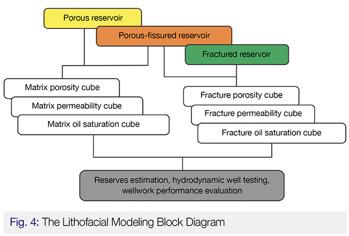 To describe the voids in the dual porosity and dual permeability model, the lithofacial modeling is carried out with reference to three types of reservoirs (porous, fractured, porous-fissured) (Fig.4).