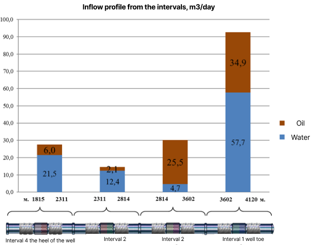 Laboratory studies (Figures 2, 3, and 4) revealed significant heterogeneity in the profile: in the interval at the bottomhole, the main water inflow was recorded — 57.7 m³/day of water and 34.9 m³/day of oil, accounting for almost 60% of the total volume; whereas at the wellhead, the values were 21.5 m³/day of water and 6.0 m³/day of oil.