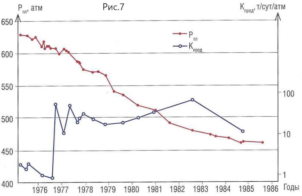 - The well has a developed target of fractured limestones, its productivity index reduced from 1.7 ton/day*atm to 0.9 ton/day*atm during the period of 16 months from the moment of its bringing into development (Fig.7). After a hydraulic acid treatment, it increased up to 23 ton/day*atm and fluctuated for consequent 8 years in the range of 5.6 – 49.4 ton/day*atm. During this period, formation pressure gradually decreased by 170 atm and nothing was undertaken to increase it. Pressure drop remained steady at the level of 3 to 4 atm for the whole period of observations after hydraulic acid treatment with the choke of 8mm was done. Decreased productivity reflects the areas of elastic and plastic deformation of rocks, while productivity growth is characteristic of matrix destruction and formation of new fractures.