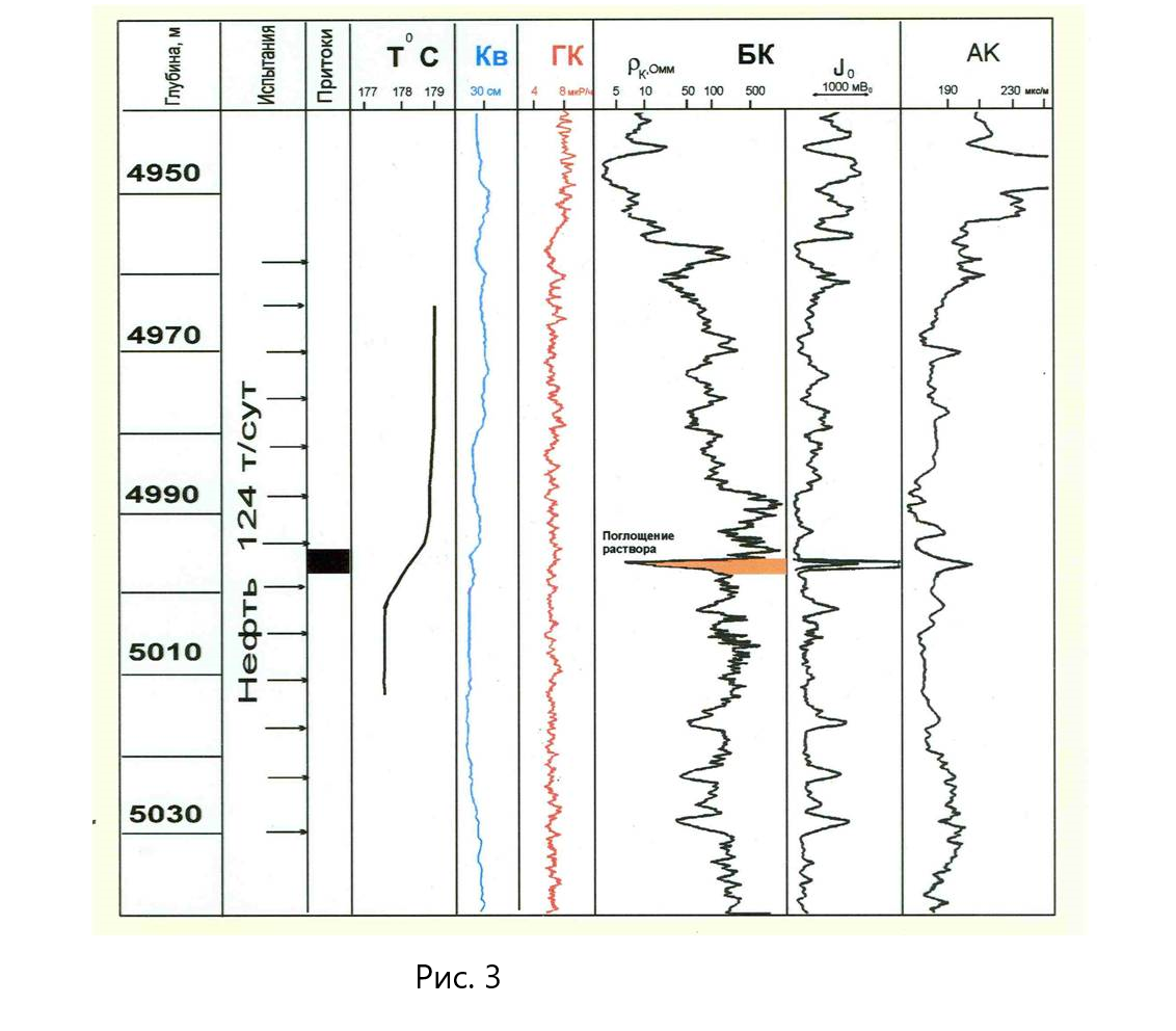 - With the target developed in the interval 3640-3672 m no inflow was registered at first; water intake was registered with pressure of 20MPa. The first hydrochloric acid treatment resulted in water spill out with flow rate of 4m3/day; oil flow with water cut followed the second hydrochloric acid treatment under bottom hole pressure of Рзаб = 25MPa; the third acid treatment resulted in a gush of oil with flow rate of 100 ton/day under Рзаб = 30 MPa.