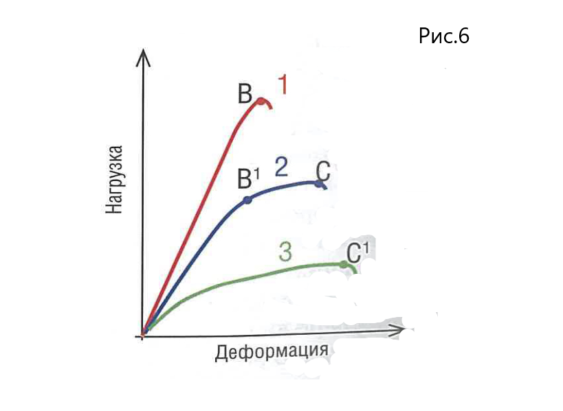 Fig. 6. Typical Diagrams of Deformation in Fragile Elastic (1) , Fragile Plastic (2), Plas-tic (3) rocks where В,В1 are limits of elasticity; С,С1 are limits of plasticity.