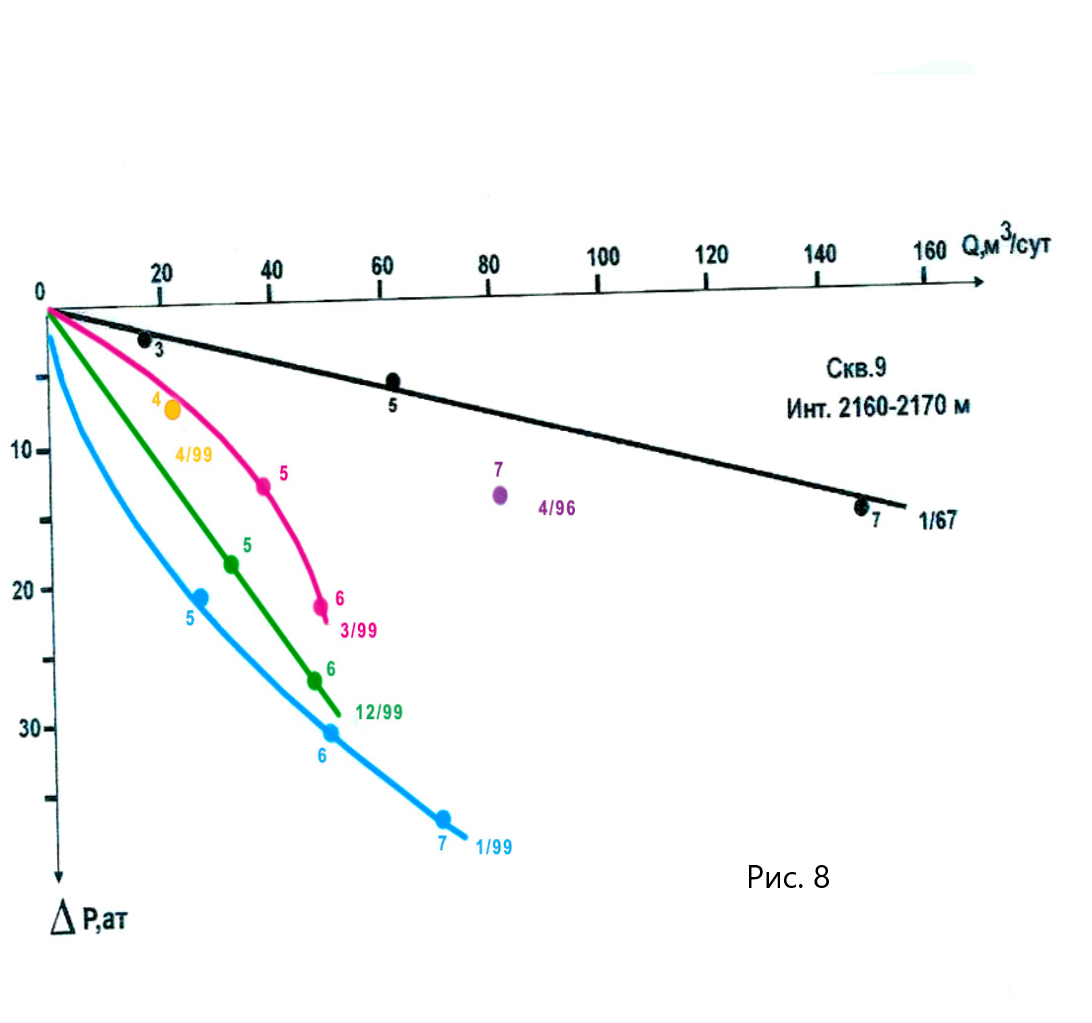 - Fig. 8 illustrates IPR curves and the dynamics of their change across time, over the target composed of fractured terrigenous rocks and metamorphised shales. The well was drilled and completed in 1967. Small drawdowns with high flow rates and straight-line IPR curve indicate well-purged fractures and steady productivity index with chokes of different diameters. Due to green field status of the field the well was in conservation before 1994. The following full-scale flow tests were carried out in 1999. Stages of elastic-and-plastic deformation and matrix rock breaking repeatedly cycled in the occurrence during the period of 1994-1999. In January 1999, the IRP curve shifted toward the left of the initial position and curves toward the axis of flow rates. Reduction of bottom-hole pressure with greater choke diameters increases rock contraction under growing tangential force and the IPR curve would have been more logical to observe toward the drawdown axis. In this case, the stage of rock breaking takes place in the well feed area, with formation of new fractures, which is intensified by the tangential stress and creation of additional fractures directly in the process of well survey. Flow tests in 2 months showed the IPR curve shift toward the right and upward which indicates the process of new cracks formation (i.e. the process of rock breaking) having effect on well performance, was prevailing in the rock mass since then. As the surveys were carried out, switching over to choke of d=6mm caused the IPR curving toward the axis of drawdowns and decreased productivity, which was determined by the impact of growing tangential stress as the process of elastic rock deformation was taking place. A single measurement with a choke of d=4mm carried out next month showed some growth in productivity and the dominant impact of the new crack formation process. The IPR of late 1999 indicates the reduction of productivity. Following April 1999, the process of rock breaking and formation of new cracks came to its end and a new stage of elastic-and-plastic deformation began, which resulted in reduced fracture opening and their permeability. Straight-line form of the ID reflects temporary equilibrium between reduced fracture opening and their increased concentration in the volume unit of rocks. Formation pressure of the occurrence was gradually decreasing and no measure were undertaken to increase it.