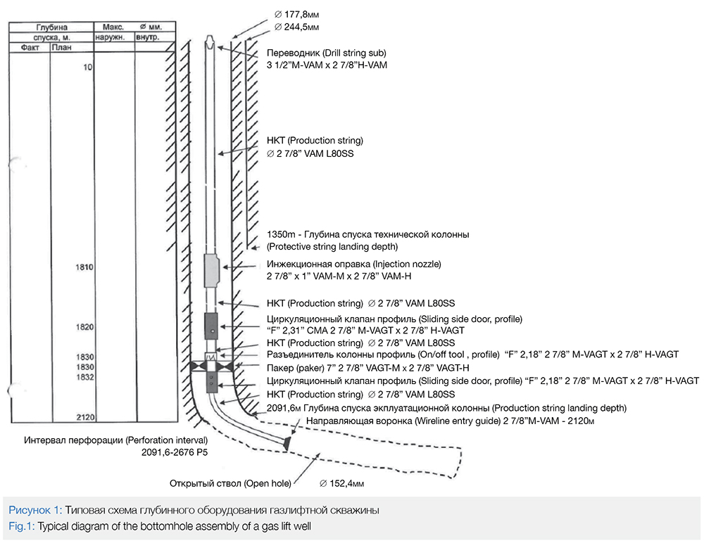 6) The process of a gas lift system operation involves the recovery of the neutralized products when different fluid motion vectors (the recovery of neutralized products from the tubing and the pumping of HCl using Coiled Tubing string) complicate the process of sidetracking due to the fact that the weight indication data is distorted; therefore, it is advisable to stop the delivery of active gas for the periods when sidetracking takes place, shutting down the manifold valve;