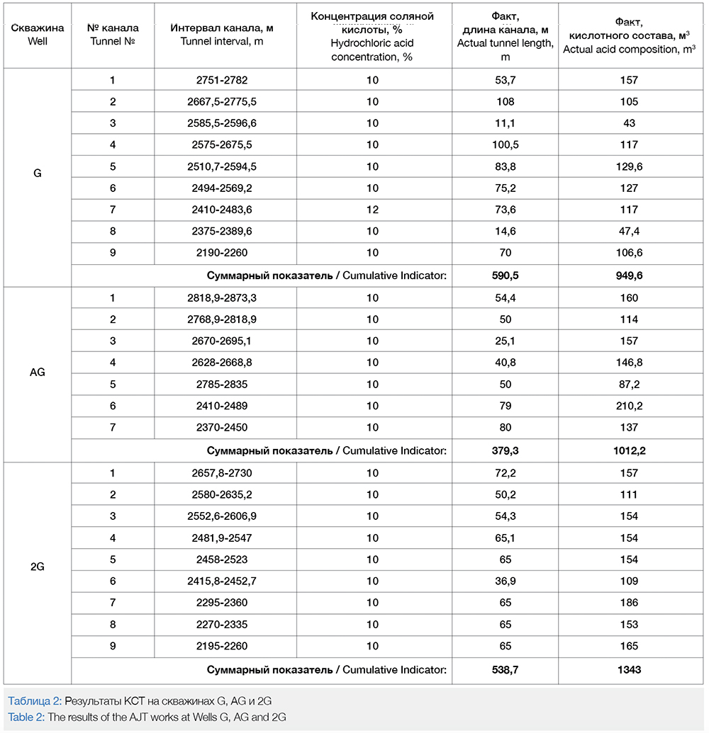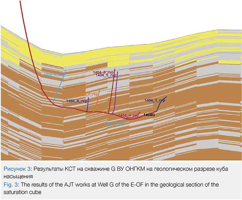 2 Horizontal wells with uncased boreholes were picked to take part in the trial. The candidate wells were featured with considerable productive formation thickness and a high degree of stratification; the well operation parameters, prior to the well intervention, are presented in Table 3. The AJT design for Well G had provisions for increasing the plugged back total depth, thus, substantiating the potential of the technology to predict the direction of subsequent tunnels. Operations at Well G made it possible to build 9 tunnels with the total length of 590.5m, the total consumption of hydrochloric acid amounted to 949.6m3 at the same time; sidetracking jobs were performed using process water as well (see Table 2). The work performance process is highlighted in Figure 2. As seen from Figure 3 all of the tunnels penetrated the overlying sublayers, however, beside the top formation zone, the bottom part of the reservoir is of pretty high geological interest. Speaking about apparent disadvantages, the following aspects of implementing the technology at Well G can be highlighted: