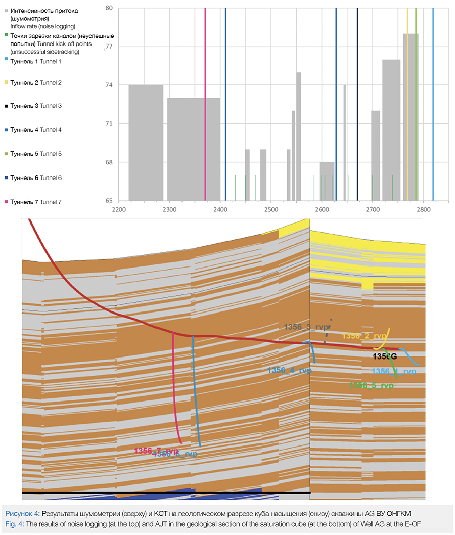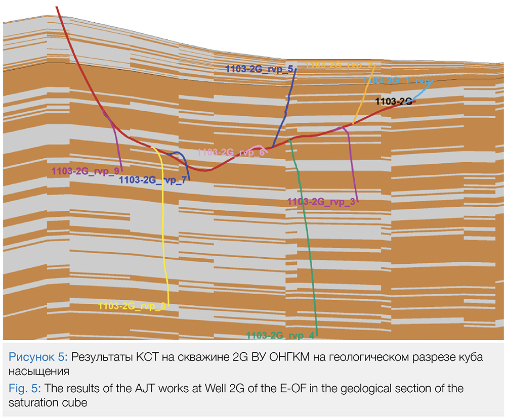 The concluding phase of the project was meant to be devoted to trying the technology’s modernization solutions at Well 2G. Overall, 9 tunnels were built, with the total length of 538.7m, and the total consumption of hydrochloric acid of up to 1343m3 (Table 3). As seen from Figure 5, a “dendritic” branching pattern was achieved, which made it possible to include into development those oil-saturated interlayers that had not been involved before. Also, it was managed to achieve the increase of the job speed from 50 to 18 days per 1 AJT operation. Noise logging was carried out after the AJT job on this well, using the results of which (Figure 4) the main inflow of the well was associated with Tunnel 7 (50%). It is supposed that Tunnel 7 has penetrated the reservoir natural fracturing area whose permeability is an order of magnitude higher than the one of the matrix rock. The contribution of Tunnels 2 and 5 has been also noticed (highlighted yellow and green in Figure 4. Some inflow of the formation fluid can be seen in the areas of previously unsuccessful sidetracking (short green columns in Figure 4), which may be a probable effect of the acid bath performed in these intervals. It is important to note that the inflow was not present at each tunnel (tunnels 3 and 6 are meant, in particular) but this phenomenon just proves “the probability of higher oil flow rate if a well has higher number of tunnels made in it”.