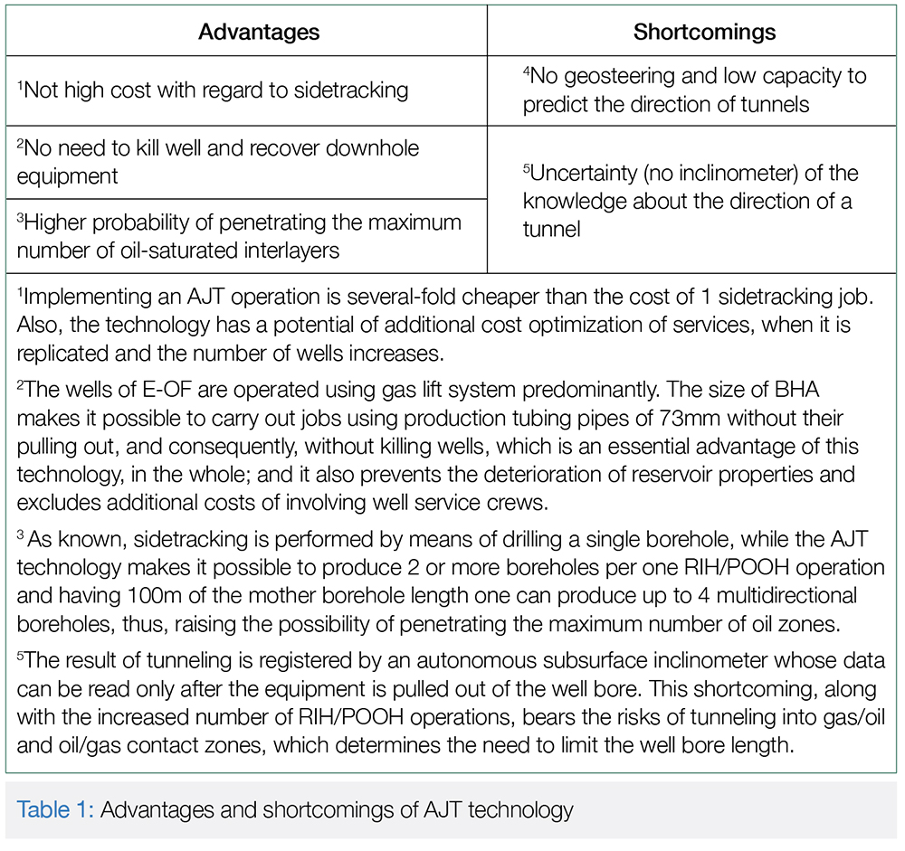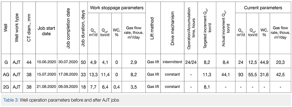 9) As a result of the performed AJT jobs, the incremented oil flow rates, obtained at Wells G and AG, amounted to 8.4(+204%) and 44.1 (+386%) tons/day, Kprod increased from 0.12 to 0.4 and from 0.29 to 2.2, correspondingly.