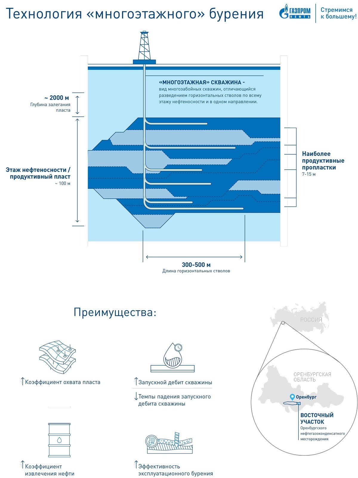 Gazpromneft-Orenburg (a subsidiary of Gazprom Neft) has commissioned the first high-tech well built using multi-storey drilling technology. This new approach makes it possible to increase initial production by more than 40 percent, as well as increasing surface efficiency (the “sweep ratio”) and development drilling efficiency.