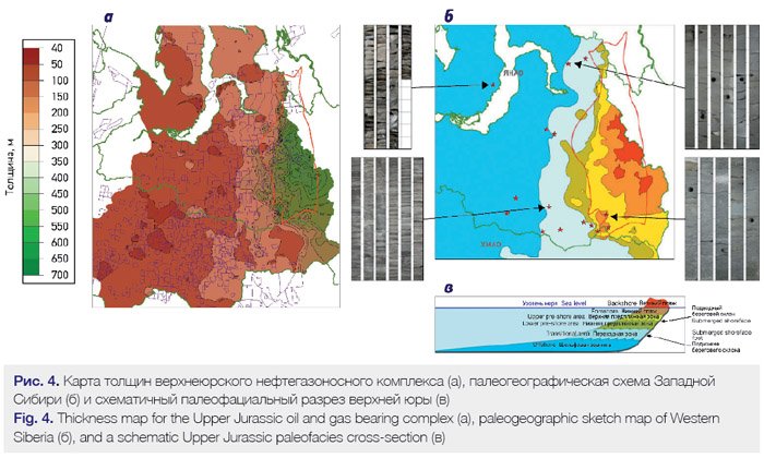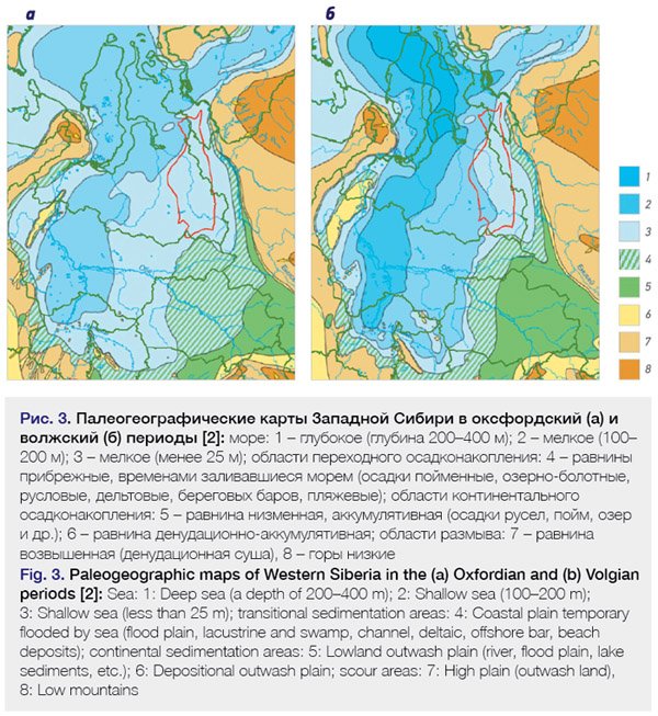 In the authors’ view, the best quality paleogeographic plotting maps covering the period of the Upper Jurassic deposit accumulation are those of the Novosibirsk Petroleum Geology and Geophysics Institute. They are based on integrated paleontological and stratigraphic, lithologic, and geochemical surveys of the deep well core samples and natural rock outcrops along with detailed seismic stratigraphic analyses (Fig. 3).