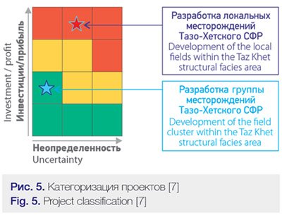 It is possible to assess the investment potential of the Taz Khet structural facies area, using the Gazprom Neft classification for exploration and production as a basis (see Fig. 5). We will review the case for exploration and bringing into production the local oil fields at the eastern edge of the Western Siberia. First, we should consider the high subsurface risks mentioned above, which magnify the subsurface uncertainty; secondly, the low likelihood for discovering large or unique oil fields dramatically reduces the chance of making a high profit; and thirdly, the area’s infrastructure is poorly developed.