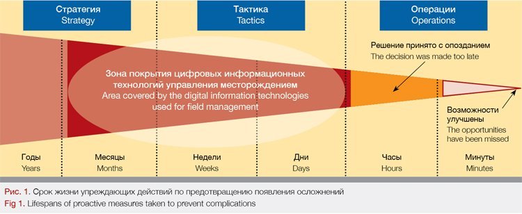 The effectiveness of the digital field, as a combination of intelligent systems, is due to the close integration of intelligent equipment and analytical information products into production business processes, such that, whenever an abnormality is detected, those integrated solutions will provide recommendations for eliminating possible risk. The quality of such solutions is ensured by combining operational data for all the field’s systems with an integrated asset model supplemented by analytical libraries, which will enable experts to analyze a particular process system and will issue suggestions on how they can optimize it and what losses it can sustain in the future (proactive protection). In the absence of digital field management systems, information is collected and used after an event has occurred, i. e. when the problem already exists, which means that trouble-free field operations may be at risk, and complications may arise (see Fig. 1) [9].