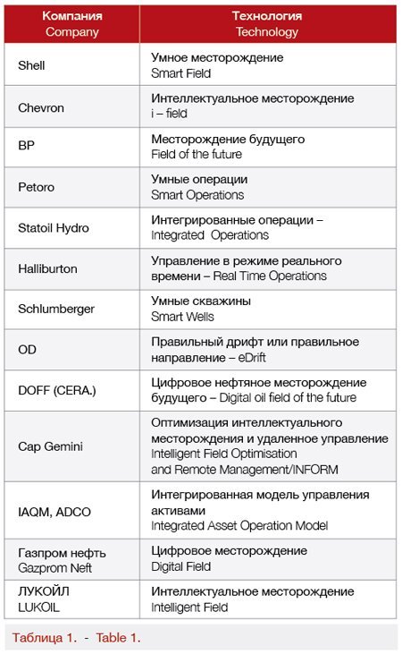The new-gen technology based on integrating a combination of hardware and software tools into the production processes of oil and gas companies has been given various names and has had its elements configured in a variety of ways (see Table 1).