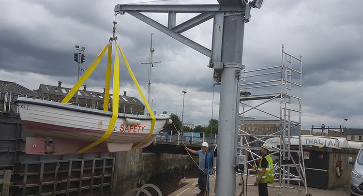 Typical Hoist and Winch project – the design, manufacture and installation of a 1000 kg swl free standing jib crane fitted with an electric wire rope winch for lifting sailing boats from the river Thames to the quayside.