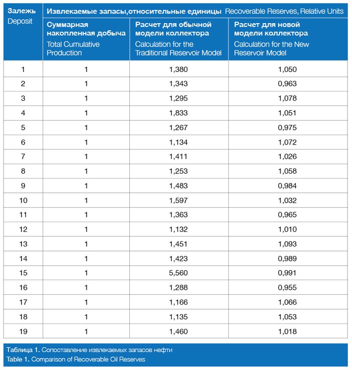 Table 1 shows comparison of recoverable oil reserves estimated by the standard method (calculation of geological reserves and multiplication by an oil recovery factor) and reserves estimated on the basis of the new reservoir model. In the latter case, effective (saturated by hydrocarbons) porosity and direct determination of the oil saturation were used. For ease of comparison, relative indicators were used. Cumulative production is assumed as 1. In all the fields for which recoverable reserves were estimated by the usual method only the over-estimation of cumulative production is observed. The over-estimation range is +(13-556%). If we assume that cumulative production from each deposit comes from a hypothetical single deposit, the over-estimation is 63%. In absolute terms this exceeds 400 million tonnes of oil. Excessive discrepancy between the estimate and actual production is due to the use of over-estimated porosity factor (void volume) (by a factor of 3 – 14) and over-estimated oil saturation factor (by a factor of 2 – 5).