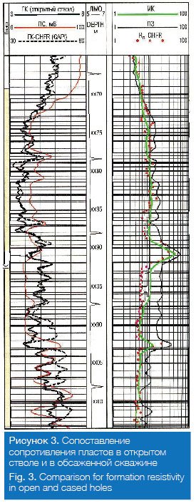 Fig. 3 compares resistivities measured in open hole and casing. In the course of the initial reservoir development in the хх85-хх97 m interval water-free oil was produced at a rate exceeding 80 m3/day. 25 years after the start of production, measured resistivity corresponded to design formation resistivity at 100% water saturation. In fact, the well produced water was injected to support formation pressure. (The overlying reservoir where resistivities measured in open and cased holes were equal, later produced water-free flow of oil to the surface).