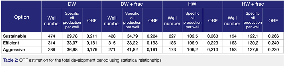 The results of the engineering simulations based on all of the options are presented in Table 2. The option for drilling deviated wells would require the maximum construction of 474 wells with the sustainable option, 289 wells with the aggressive option; for 25 years, the specific oil production would amount to 29.8 thousand tons and 36.7 thousand tons, according to the options, respectively. When we move to the next options and well completion types, the number of wells goes down and the specific oil production per well grows.