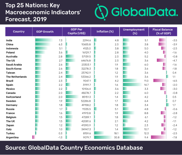 Financial markets stayed weak across all the major economies in 2018. However, India, Brazil, Japan and Mexico are expected to sustain their growth momentum in 2019 owing to slower pace of monetary tightening, expected improvements in labor market conditions and stable domestic consumption. While the world economy is expected to witness an average 3.5% growth, the major 25 economies tracked by GlobalData are projected to achieve a lower average growth rate of 2.4% in 2019.