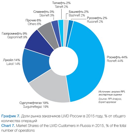 In 2015 the maximum number of the MWD operations in Russia was conducted by Rosneft (44%) — the clear leader in drilling operations among the oil companies.