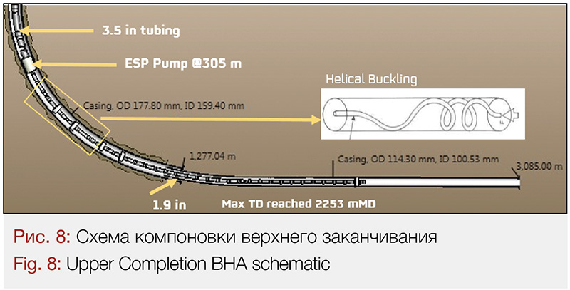 The unexpected problem happened with upper completion string installation. The string design (3.5’’ TBG inside the 7’’ casing and 1.9’’ TBG inside the 4.5’’ liner with the ESP in between) had a limitation of the max cased hole SOFF of 0.20 to get the string to TD. The preliminary Wellplan (Landmark) T&D simulations did not show any issues with upper completion installation. However, once a detailed BHA was introduced into the model, the results of K&M’s ERA software showed that any SOFF numbers higher than 0.20 would result in string lockup. During execution, the first unsuccessful upper completion run showed an actual CH SOFF of 0.30 and the weight went to zero (string lockup) exactly at the depth predicted by ERA software for SOFF of 0.30. The lockup point was in the 1.9’’ TBG below the ESP at a distance where the lightweight tubular with less buckling resistances were still inside the 7’’ casing with the more room to get buckled at same compression in comparison with 1.9’’ tubular inside the 4.5’’ liner.