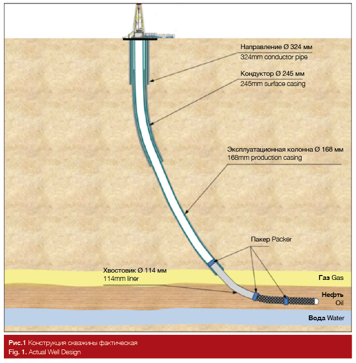 The following well design is usually used when developing an oil rim: a conductor pipe, a surface casing, a 168/178mm production casing, a shoe that is set on the top of pay zone, and a 114-mm slotted liner with upper blind pipes which is run to the pay zone followed by collar cementing of the blind pipes (Fig. 1).