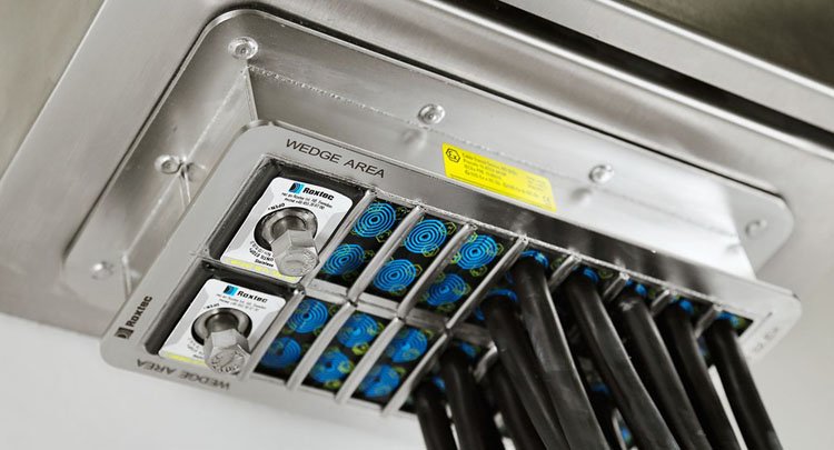 One cut-out for a Roxtec HD (high density) transit can accommodate up to 41 armored or non-armored cables, drastically reducing the amount of space required when compared to 41 cable glands. Use them in terminal boxes, cabinets, enclosures and remote I/O panels to improve space efficiency and cost-effectiveness. Cut weight by half and increase cable capacity by up to 40 percent.