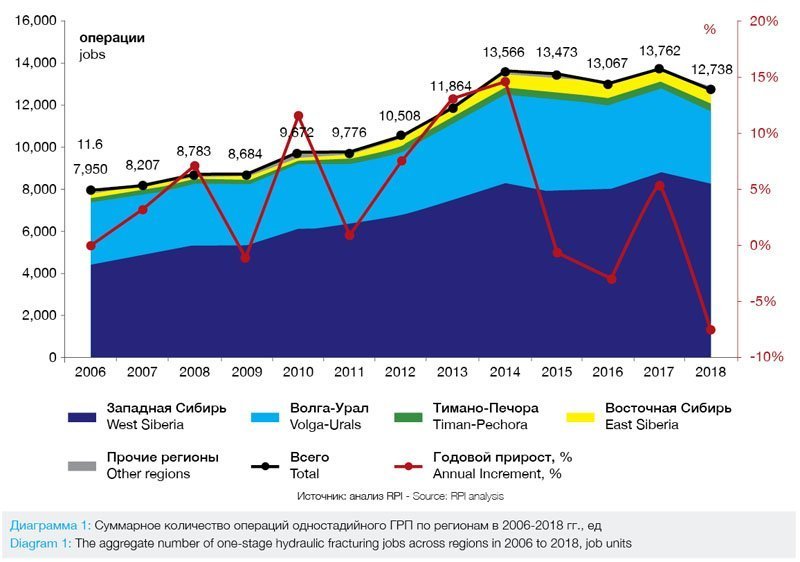 Исключение составили 2009 и 2014 годы, когда прирост операций одностадийного ГРП был отрицательным в связи со снижением инвестиций в нефтегазовую отрасль, вызванным экономическим кризисом и падением цен на мировом нефтяном рынке.