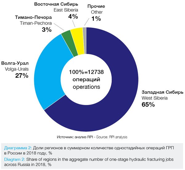 В прошлом году более 90% операций одностадийного ГРП на переходящем фонде скважин пришлось на Западную Сибирь и Волго-Уральскую провинцию. В частности, доля Западной Сибири составила 57%, доля Волго-Урала – 37%. Это вызвано тем, что в упомянутых регионах находятся крупнейшие фонды старых скважин, там же расположены наиболее старые истощающиеся месторождения.