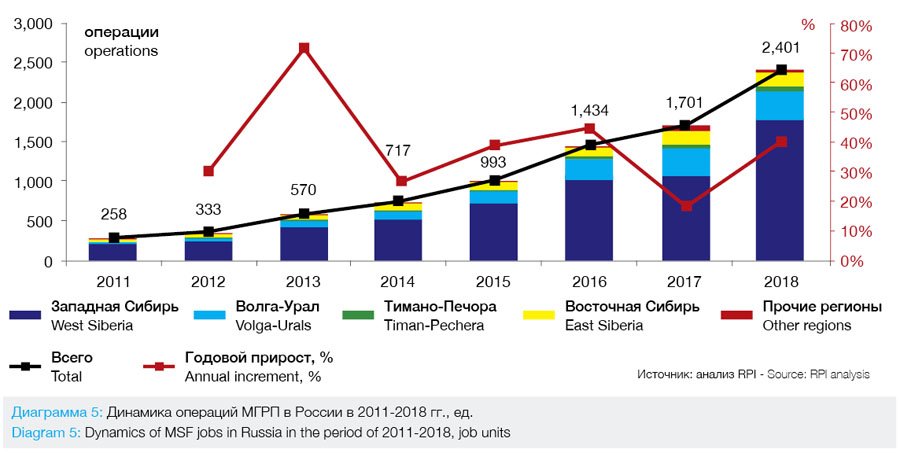 Операции многостадийного ГРП (МГРП) – сравнительно новая, быстроразвивающаяся технология в сегменте ГРП. Широкое применение операции МГРП получили с 2011 года. В 2011-2018 гг. количество операций МГРП в России стабильно росло на 37,5% в среднем в год, и к 2018 году этот показатель в абсолютном выражении достиг 2401 ед. (см. Диаграмму 5). Этот тренд связан с увеличением ввода в эксплуатацию горизонтальных скважин и зарезки боковых горизонтальных стволов.