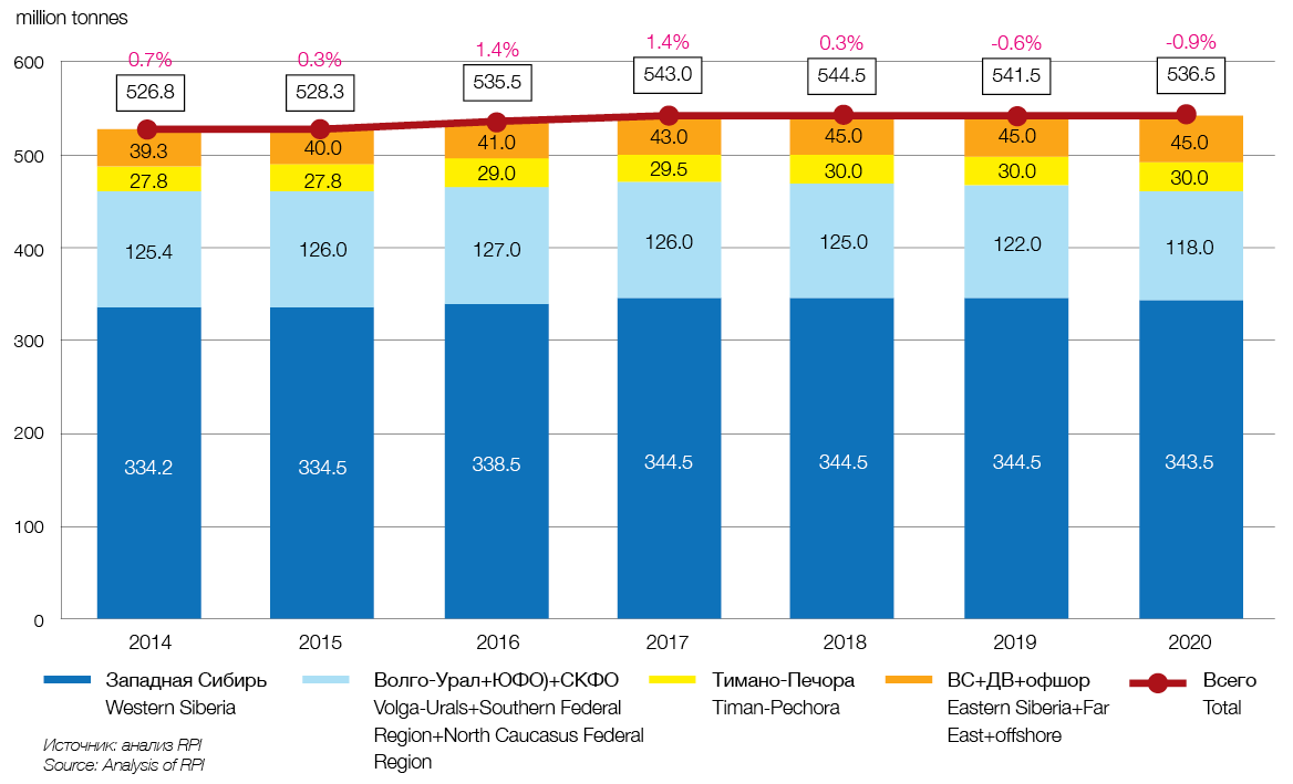 Based on this forecast, in 2018 Russia will essentially reach the annual peak production of oil and condensate of approximately 545 million tonnes per year. This will be followed by gradual reduction due to depletion of operating fields and delays in bringing new fields into production.