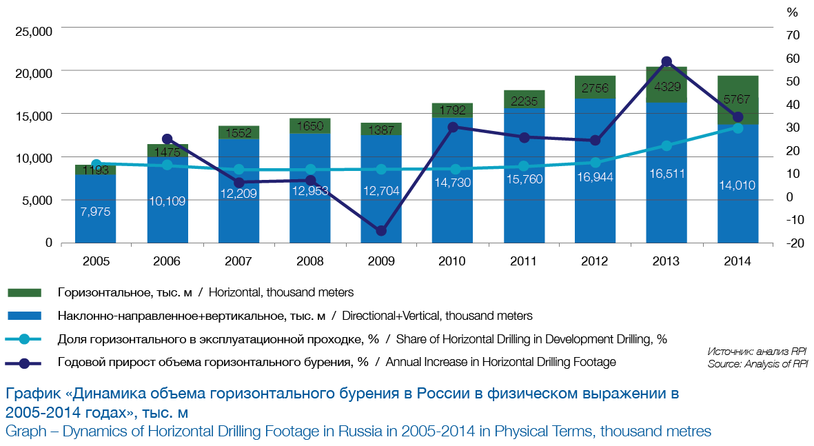 In 2010-2011 horizontal drilling annual growth rates throughout Russia increased by 29% in 2010 and by 25% in 2011 (compared to the previous year). In 2012 the annual, absolute increment in horizontal drilling was 21%, and in 2013 it exceeded 60%, having reached 4.3 million metres.