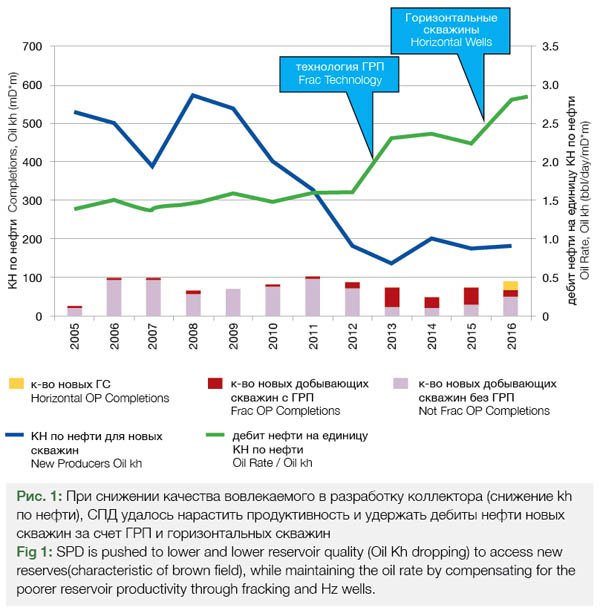 Nevertheless, Salym was a declining production field. With all the sweet spots drilled, the subsurface group could only target parts of the license with lower and lower reservoir quality (illustrated by Kh – horizontal permeability x net pay). Despite that inherent challenge of brown field and under the leadership of a new Management Team SPD decided to take on the challenge to ramp up its production. That decision triggered a series of initiatives to reverse the trend, including the introduction of Fracking, which resulted in an increase of 60% in new oil productivity from 2013 onwards as can be seen in the graph in figure 1.