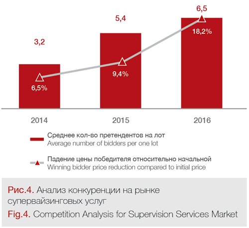 Currently there are 40 companies in Russia that provide supervision services. When analyzing the tender data base and available accounting documentation for 2015 (Kontur Focus), only five companies command more than half of the market share. The remaining market is occupied by many small enterprises and non-core divisions of leading service companies.