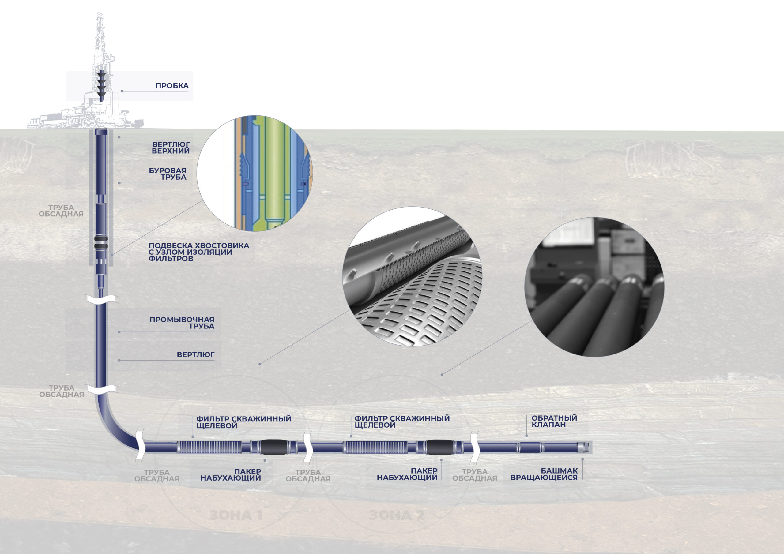 It is not an easy task to run in hole a 178 mm non-cemented liner completed with a screen at such TVD and in case the horizontal section exceeds 2000 m in length. In addition to the conventional procedure for drilling horizontal wells, presuming rotary-steerable systems, top drive and oil-based muds, Technology Group of TatProm-Holding Group proposed to run in hole PKhGMN UIF (ПХГМН.УИФ) 178/245 (hydromechanical non-cemented liner hanger with a screen isolation unit, having the option of flushing through the liner shoe); and to use of a special swivel for rotation of the liner and a swivel preventing rotation of the washpipe for its safe removal.