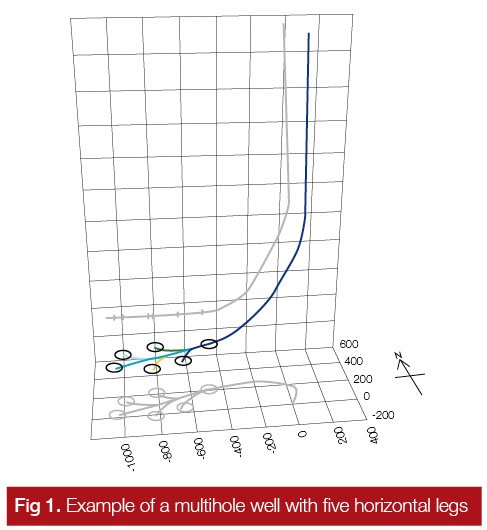 Currently, the demand for horizontal directional drilling has not reduced; instead, it has increased significantly. Horizontal drilling, overall, is more efficient and cost effective than vertical or slant wells once the well comes online. As a result, customers plan to drill more complex three-dimensional (3D) horizontal extended reach drilling (ERD) wells using advanced directional drilling technology, which Sperry Drilling is able to provide. Also customers increasingly realize the benefits of drilling multilateral horizontal wells strategically placed within the target reservoir, an area where Sperry Drilling has become a market leader, not only in Russia but also globally. Specifically, in Russia, Sperry Drilling has successfully completed wells of between three to five horizontal legs (Fig. 1) using openhole sidetracking to a total length of greater than 2,000 m.