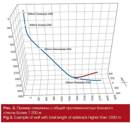 Drilling a sidetrack can reduce costs associated with the top side (TS) construction of wellheads and pipelines and “subsurface” casing construction, as these are already in place. Sperry Drilling has extensive experience in drilling sidetracks of different diameters and lengths (over 1200m) (Fig. 3). Drilling these wells addresses most customer issues. More complex wells require an individual approach and a wide range of specialists, such as optimization engineers (ADT® drilling optimization service), who are responsible for monitoring and optimization processes in real-time.