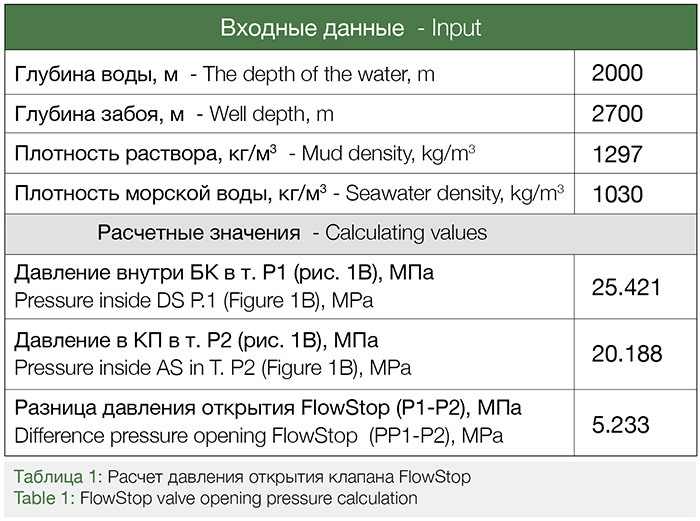Для уравновешивания давления в U-образной трубе во время бурения с двойным градиентом, ведущими международными сервисными компаниями были спроектированы забойные клапаны, позволяющие останавливать переток из КП в БК. Однако окончательно проблема перетока бурового раствора с БК в КП при бурении была решена только в 2001 году с помощью забойного клапана FlowStop [14]. При остановке буровых насосов и циркуляции бурового раствора в системе БК-КП FlowStop останавливает переток бурового раствора не только из КП в БК, но главное из БК в КП. Данный забойный клапан располагается над долотом и заранее регулируется на определенное расчетное давление открытия с помощью изменений характеристик пружины. Пример расчета давления открытия FlowStop представлен в Таблице 1. Согласно данному расчету на давление открытия данного клапана влияют два фактора – глубина моря и плотность бурового раствора.