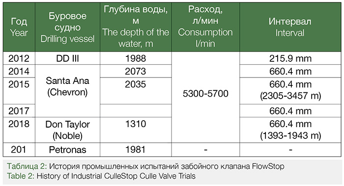 История промышленных испытаний забойного клапана FlowStop приведена в таблице 2. При испытаниях основные цели Оператора, а именно стабилизация «U-tube» эффекта в системе БК-КП, экономия времени, выявление придонного газа — были достигнуты. Кроме того, буровой подрядчик по инклинометрии во время испытаний на буровом судне Santa Ana подтвердил высокоскоростную телеметрическую связь со скважиной при использовании забойного клапана FlowStop.