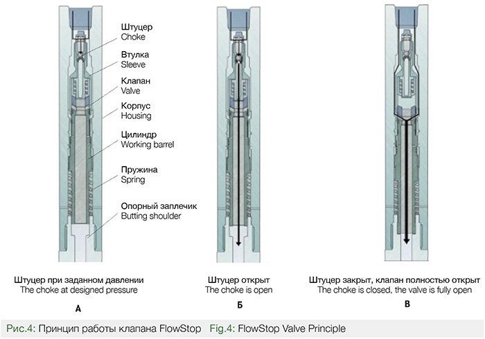 Принцип работы клапана FlowStop представлен на рисунке 4. Клапан имеет две ступени открытия. Первая ступень — открытие штуцера (рис.4Б). Вторая ступень – закрытие штуцера и открытие клапана (рис.4В). При увеличении расхода бурового насоса и создании давления открытия пружина сжимается, и цилиндр перемещается вниз до опорного заплечика. При этом происходит открытие клапана, и поток бурового раствора устремляется вниз. Если необходимо проверить на приток из скважины, то бурильщик уменьшает расход насосов и, следовательно, снижается давление внутри БК и давление открытия, что в свою очередь приводит к закрытию клапана и штуцера (рис.4А). Путь для движения бурового раствора через штуцер или клапан-цилиндр закрывается, что помогает исключить дисбаланс в U- образной трубе в системе «КП-БК». Для того, чтобы заново открыть клапан и начать бурение, необходимо увеличить расход буровых насосов и создать давление открытия во FlowStop.