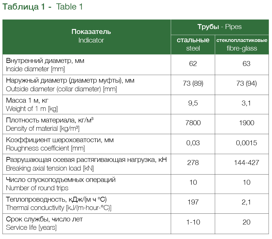 В таблице 1 представлено сравнение физических и эксплуатационных свойств стальных и стеклопластиковых труб [1].