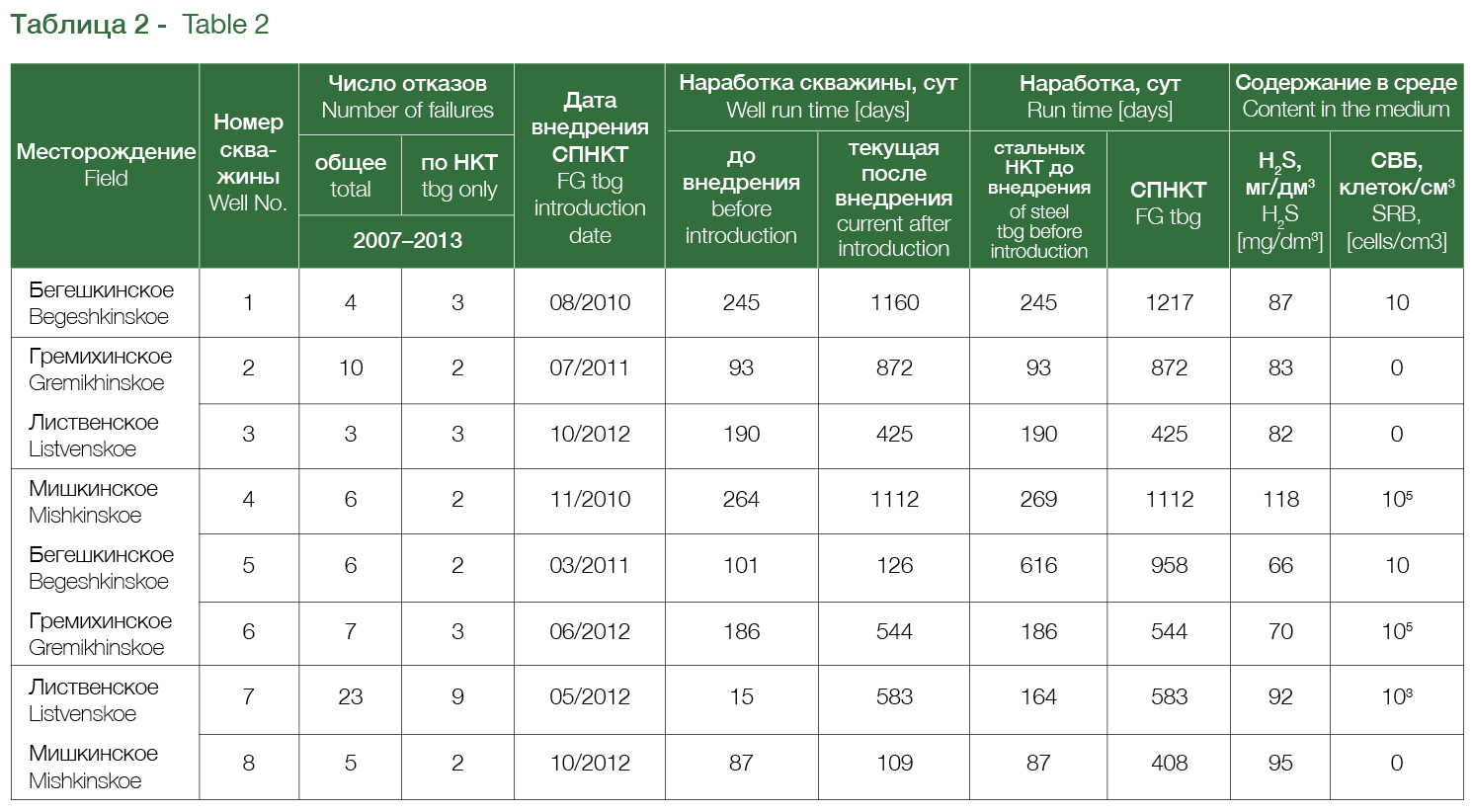 В настоящее время уже порядка 120 скважин оснащено стеклопластиковыми трубами, из них 46 % приходится на добывающий фонд, 15% на поглощающие скважины и 39 % на нагнетательные. Использование СПНКТ позволило существенно увеличить наработку добывающих скважин в 2 и более раз, что наглядно представлено в таблице 2.