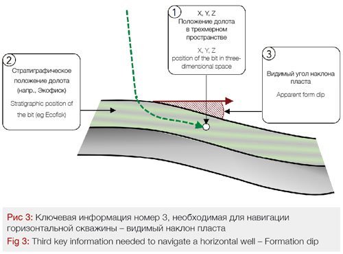 Knowledge of the bit’s stratigraphic position allows specifying the geometrical boundaries of the targeted reservoir at a given position of the borehole; and determines the amount of room above and below the bit in case a change of drilling direction is required (as long as the vertical and lateral dimensions of the targeted reservoir are known.) This is partially resolved by the TVDSS measurement from the survey measurement as the bit position can be concluded from the anticipated thickness of the targeted reservoir. It should be taken into account however, that the horizontal thickness of the target may vary significantly along the well path.
