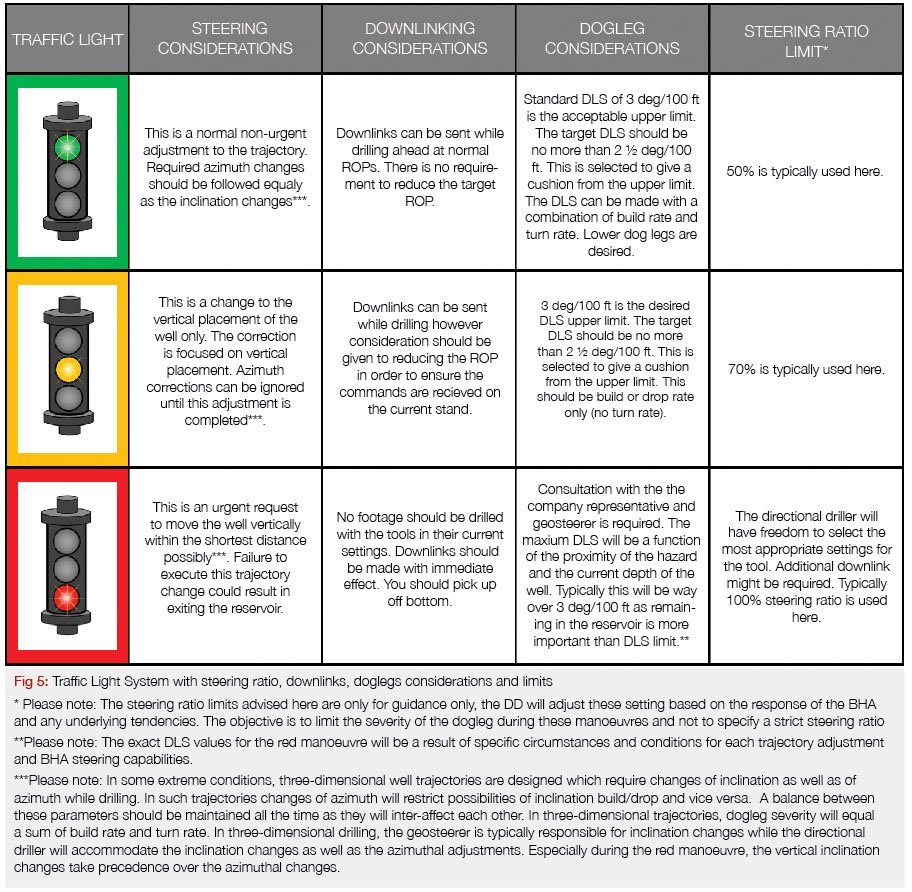 The geosteerer by defining the colour of the manoeuvre (green, yellow or red) and communicating it the directional driller sets the urgency and establishes a fashion in which the adjustment will be performed. This obviously will depend on the situation and circumstances. Identified criticality will allow the directional driller to immediately estimate how fast the manoeuvre needs to be performed, what steering ratio he/she should apply to the tool and what values of DLS and ROPs are required for a given adjustment. The Traffic Light System not only allows the message to be conveyed, but also “describes” the surroundings the BHA will have to deal with. Please see figures 5 and 6 for more details.