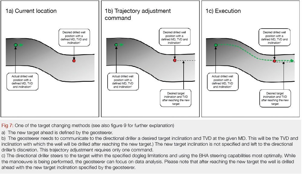 Having acquired the knowledge of all four key information portions at any given point of the drilled trajectory, the geosteerer needs to deduct the most optimal steering direction and communicate it to the directional driller.