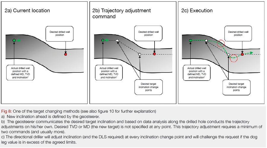 By default, a change of steering direction should occur only when an evident prerequisite arises and not based on a premonition that something might occur. The steering adjustment must also be adequate to the circumstances. A drop of inclination that requires exceeding a dogleg limitation of 3 degrees can be only justified in a hazardous situation with the potential of exceeding a targeted reservoir.